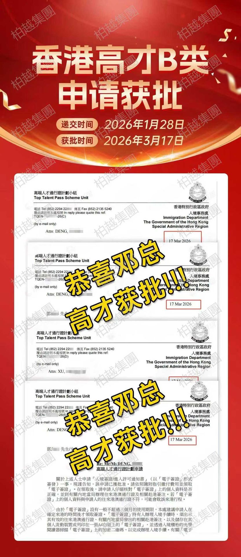 恭喜鄧總成功拿下香港高才通 B 類簽證,全家隨行同步獲批!