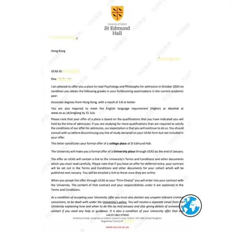 協助一位香港學生成功申請牛津大學著名的心理學與哲學聯合課程(Psychology and Philosophy)。該學生在柏越團隊的指導下,完成了聯合申請文書準備、面試模擬訓練,並滿足了英文語言要求。最終於2024年1月獲得聖埃德蒙德霍爾(St Edmund Hall)的正式錄取通知書。柏越團隊協助其完成簽證規劃與赴英行前準備,確保學生順利開啟英國頂級學府的求學之旅。