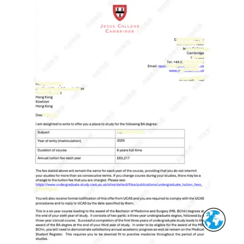 協助一位香港學生成功申請劍橋大學耶穌學院(Jesus College)的醫學科學課程(Medical Sciences),此為6年制從本科到臨床醫學的完整課程。該學生在柏越的專業指導下準備GCE A-Level考試(目標化學達A*),完成複雜的醫學申請流程,並於2025年1月獲得劍橋正式錄取。年度學費為£83,217,柏越協助規劃完整的財務支持方案、簽證手續及校園適應計畫,助其實現醫學夢想。